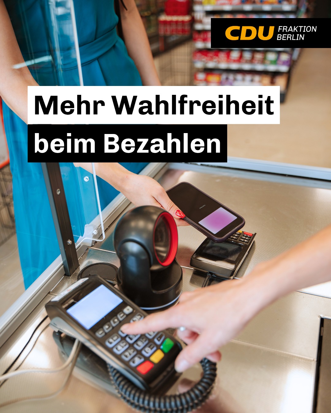 mehrKunden sollen endlich die Wahl haben. Schluss mit "Cash-only".Noch immer können Sie in Berlin in vielen Restaurants oder Geschäften nicht mit Karte zahlen. Das ist unpraktisch ? und begünstigt Steuertricks.Als Koalition wollen wir deshalb eine Bundesratsinitiative starten:Mindestens eine digitale Zahlungsoption soll künftig Pflicht werden.Eine Bezahlung mit Bargeld bleibt aber möglich.