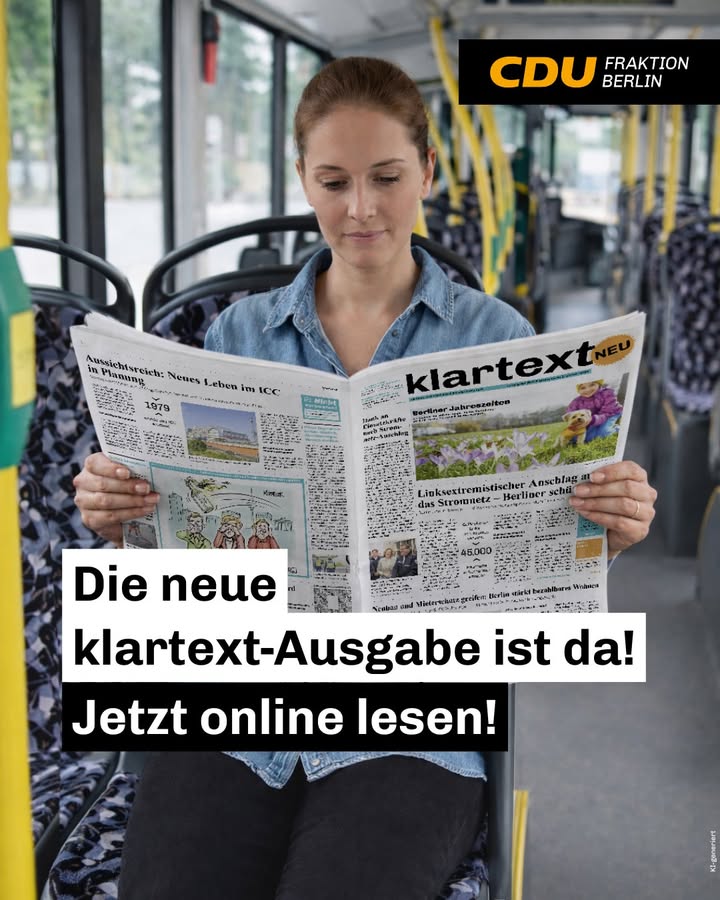 mehr🌷 Die neue Februar-Ausgabe von Klartext ist da! 🌷 Mit aktuellen Themen, klarer Haltung und konkreten Zahlen aus Berlin. In dieser Ausgabe für Sie: ⚡ Linksextremistischer Anschlag auf das Stromnetz ? wir benennen die Gefahr klar 🏗️ Über 5.000 neue Wohnungen genehmigt & Wohnraumsicherungsgesetz beschlossen 👩🏫 Lehrkräfteversorgung in Berlin auf gutem Weg 📊 Infografik: So wohnt Berlin 💉 Höhere HPV-Impfquote ? Prävention statt späterer Krebserkrankungen ? Plus unser beliebtes Kreuzworträtsel und vieles mehr! Jetzt reinschauen ? Link in der Bio.