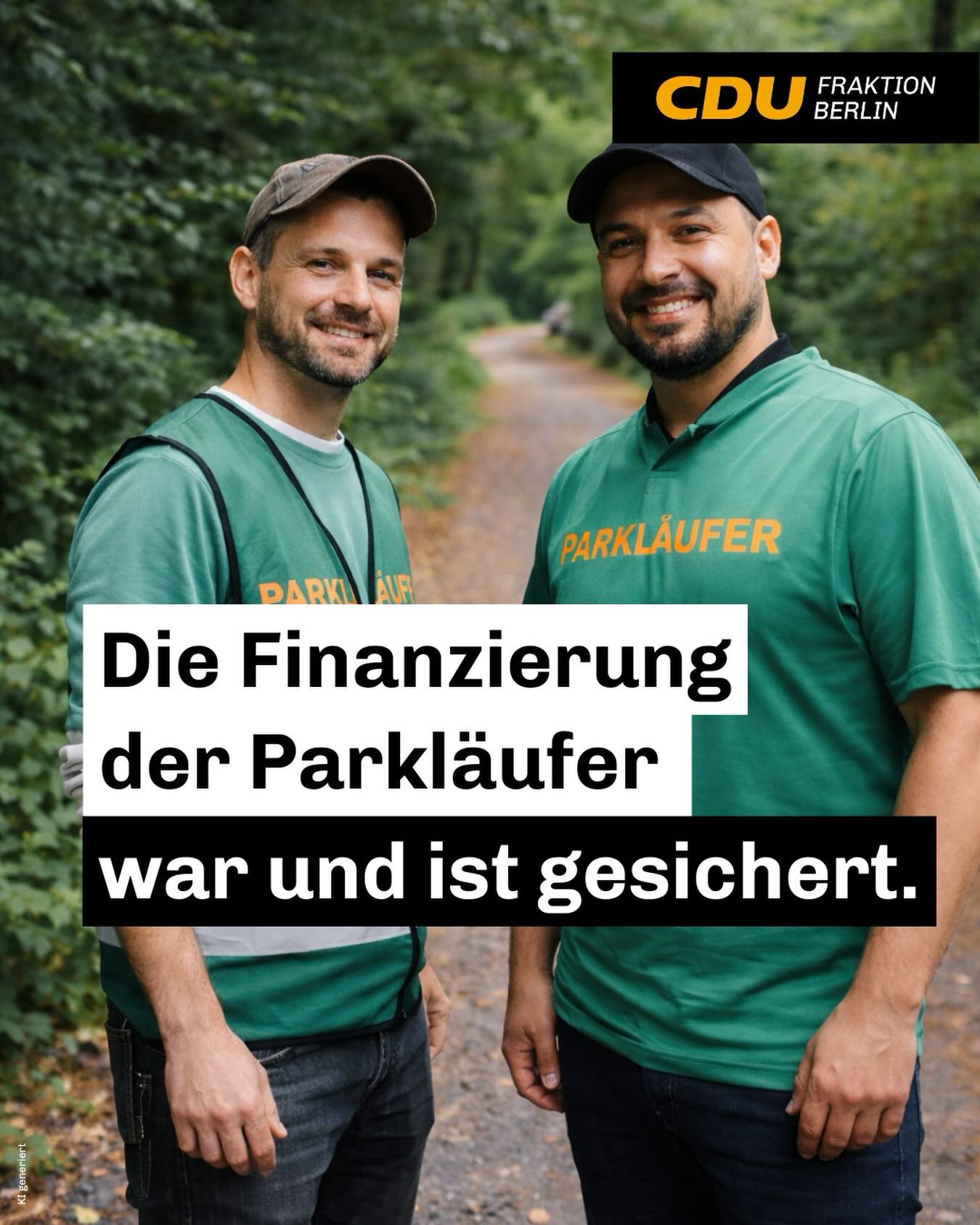 Die Parkläufer sind und waren gesichert. 🌳Auch wenn aus bestimmten Kreisen immer wieder behauptet wurde, die Parkläufer seien nicht abgesichert ? das war und ist schlicht falsch.Bereits mit der Verabschiedung des Doppelhaushalts wurde die dauerhafte Parkbetreuung verbindlich finanziert. Und auch das Schreiben zu den Mehrmitteln hat diese Absicherung nochmals ausdrücklich bestätigt.✔ 6 Mio. ? berlinweit✔ Bis zu 500.000 ? pro Bezirk 2026✔ Eigenes Produkt "Parkbetreuung" ab 2026✔ Ab 2028 fest im RegelbudgetWir stehen für mehr Sauberkeit und mehr Ordnung in unseren Parks.